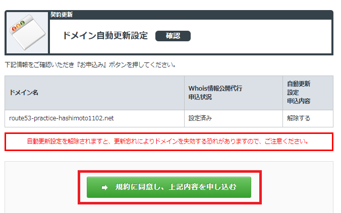 STEP9:自動更新設定申込内容が「解除する」となっているのを確認し、赤枠のボタンを押します。