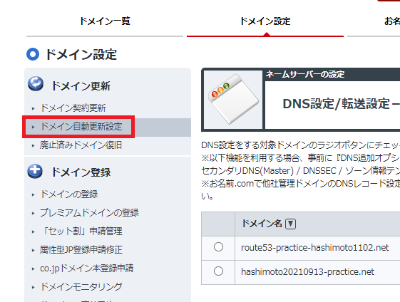 STEP6:お支払いの自動設定をオフにします。今回はテストなので、自動更新設定をオフにしますが、自動更新のままで良い場合はSTEP6以降の設定は不要ですので、Route53とEC2(EIP)の設定を行ってください。ネームサーバの設定 → ドメインのDNS設定をクリックします。