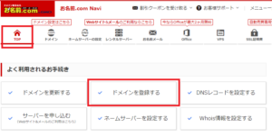 STEP1:お名前ドットコムのTOPページでドメインを登録するボタンを押します。