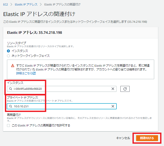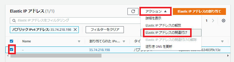 STEP6:割り当てたEIPのチェックボックスにチェックを入れ、アクション → Elastic IPアドレスの関連付けをクリックします。