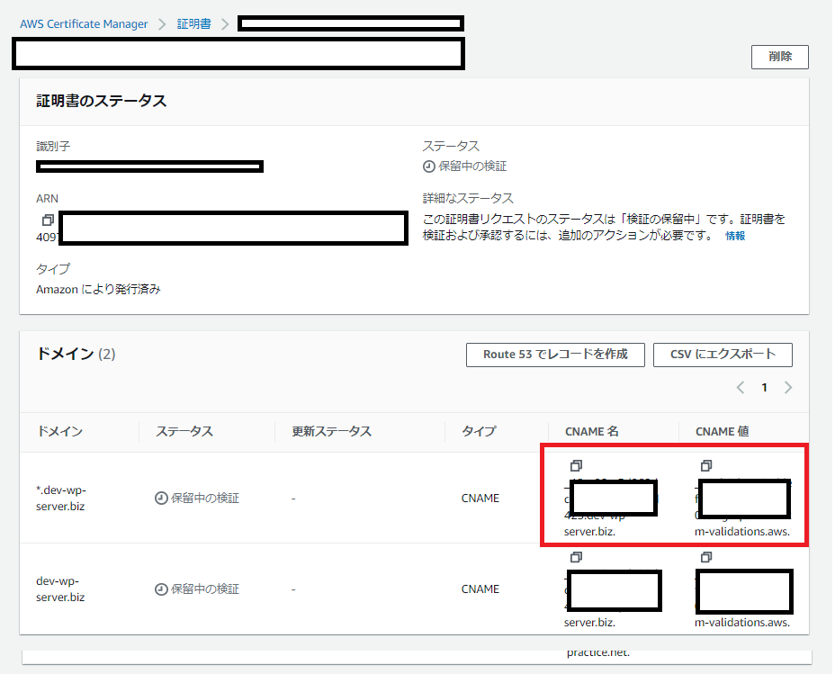 Route53にCNAMEの登録を行うために、CNAME名とCNAME値をコピーしておきます。