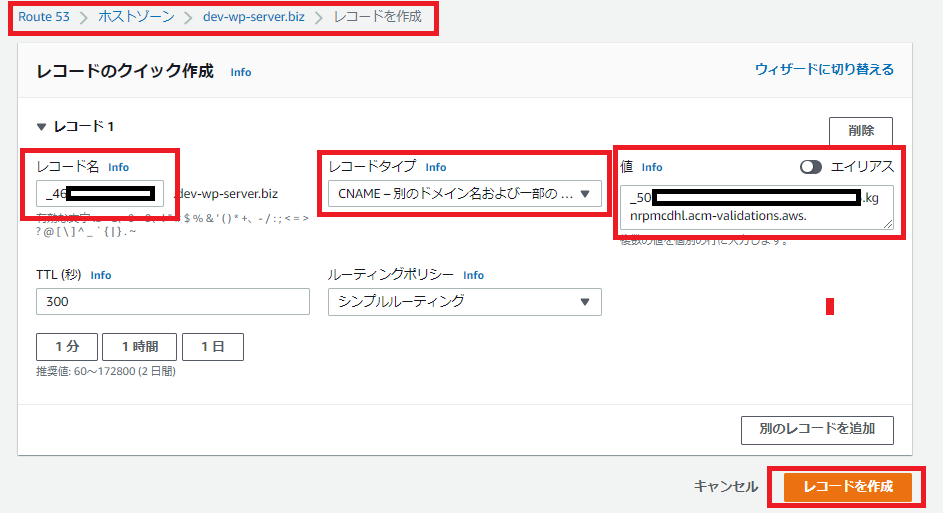 STEP6でコピーしたCNAME名をレコード名、CNAME値を値にコピペします。レコードタイプはCNAMEを選択します。