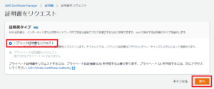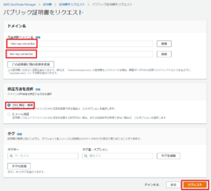 これで「image.dev-wp-server.biz」と「dev-wp-server.biz」の証明書を発行できます。証明書の確認方法はDNS検証にします。