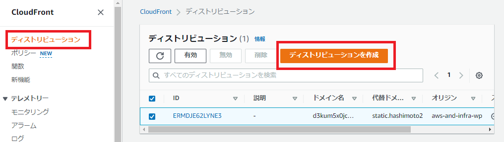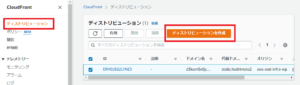 CloudFrontのダッシュボード → ディストリビューション → ディストリビューションを作成をクリックします。