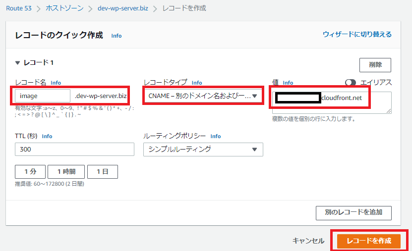 CloudFrontのディストリビューションに代替ドメインを登録しましたが、まだ画像はCloudFrontデフォルトのドメイン名から配信されるようになっています。ここではCNAMEレコードを作成し、「代替ドメイン(image.dev-wp-server)がCloudFrontデフォルトドメインに飛ぶよう」にします。