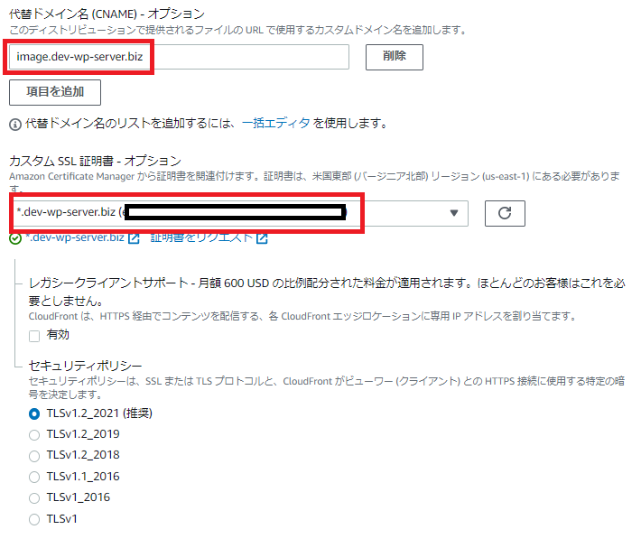 これでCloudFrontのディストリビューションに代替ドメイン名を追加できました。