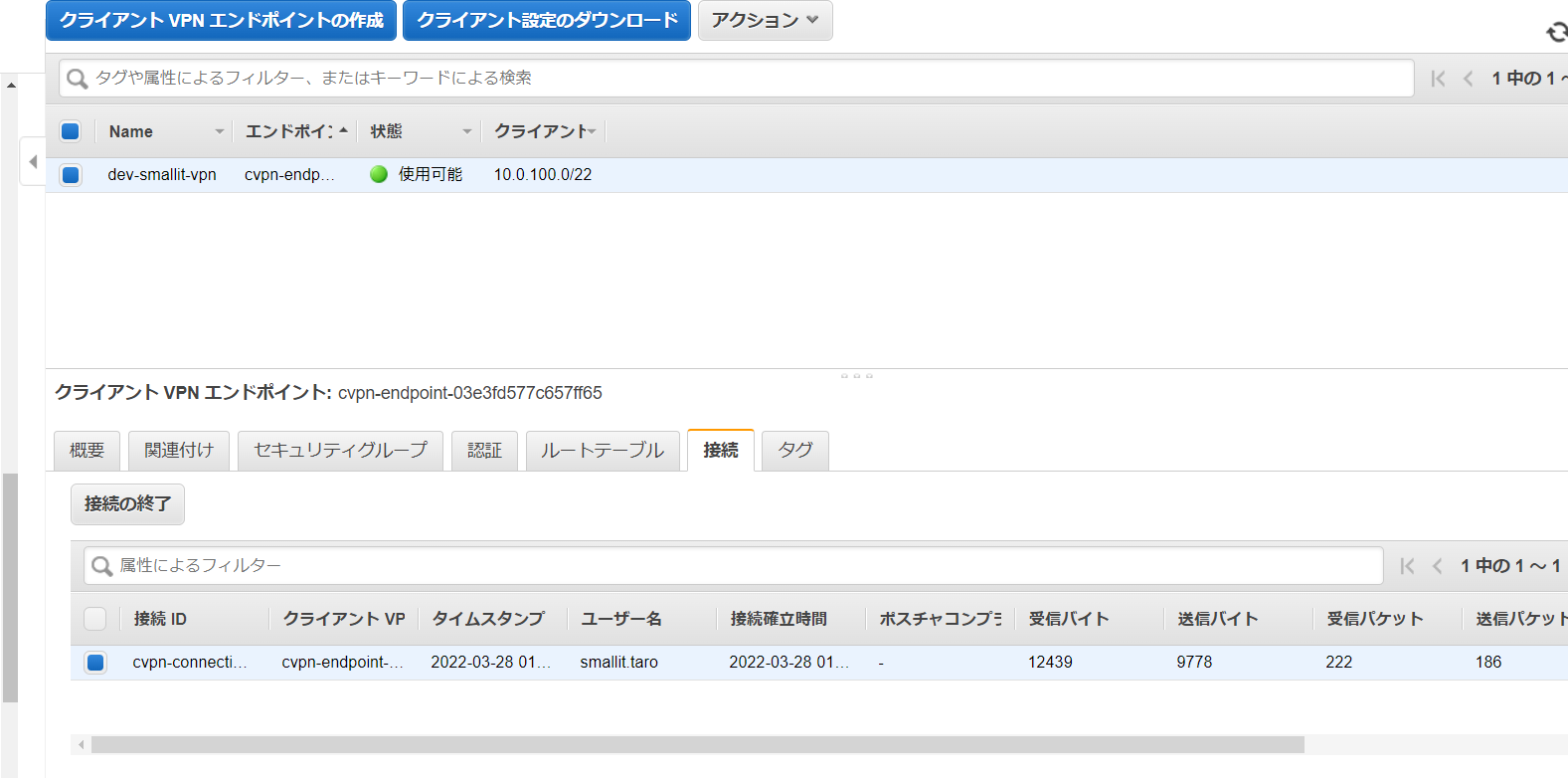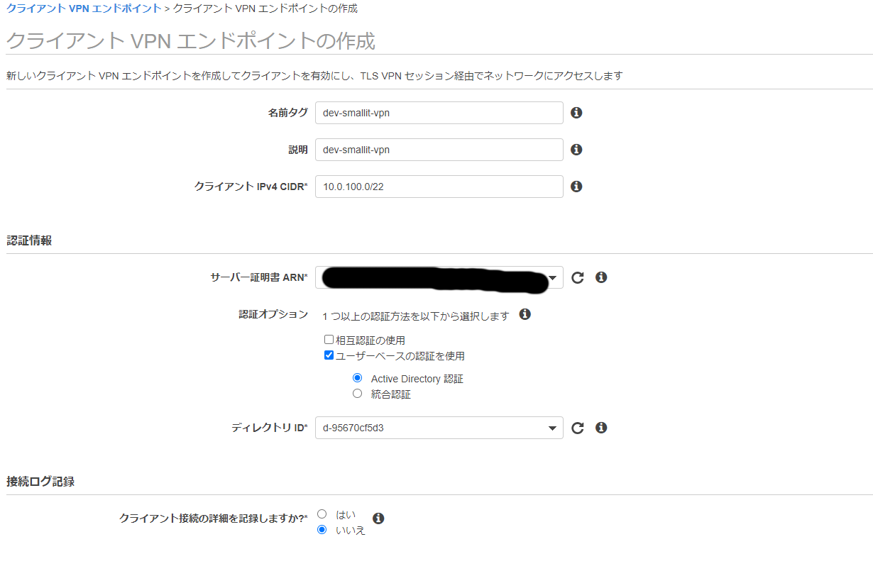 クライアントIPv4 CIDR:10.0.100.0/22