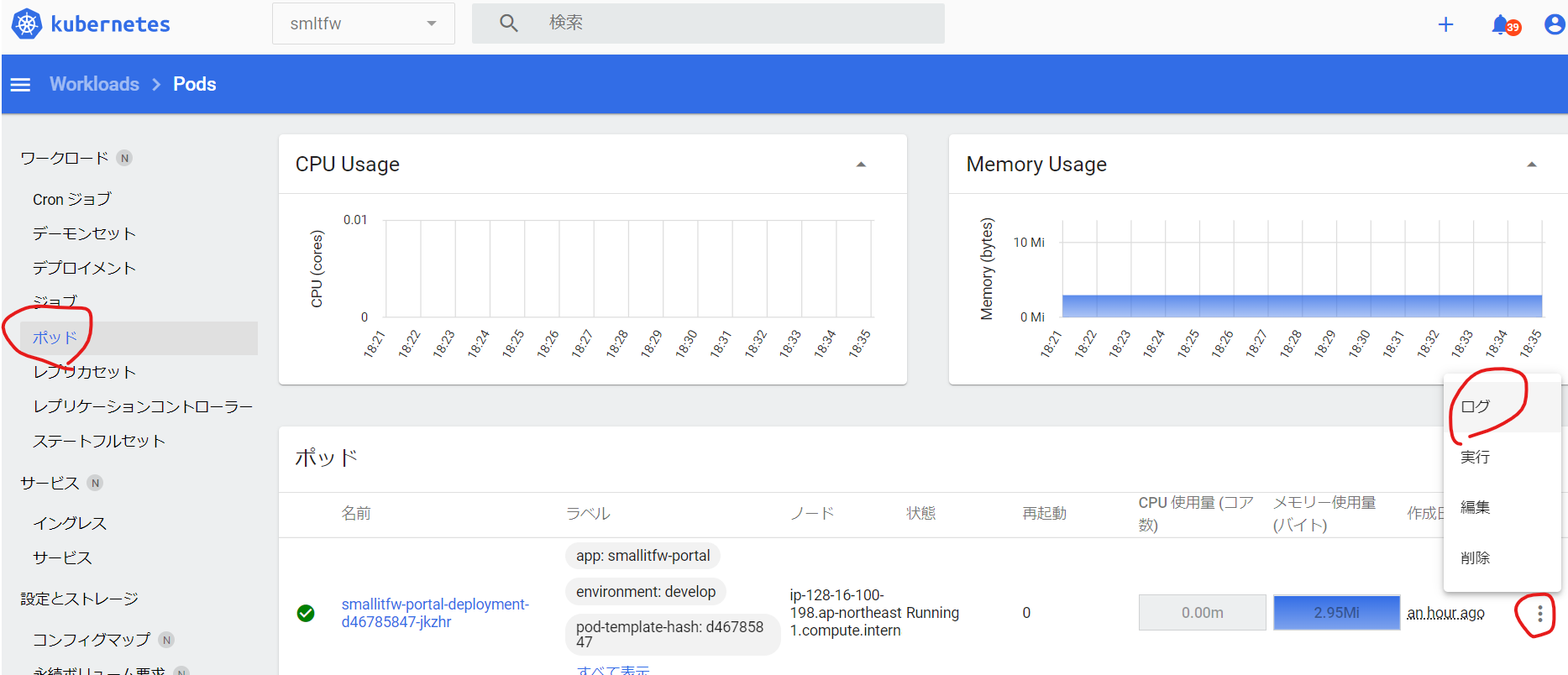 ③左のメニューで「ポッド」を選択し、ポッドの三点メニューから「ログ」を選択する
