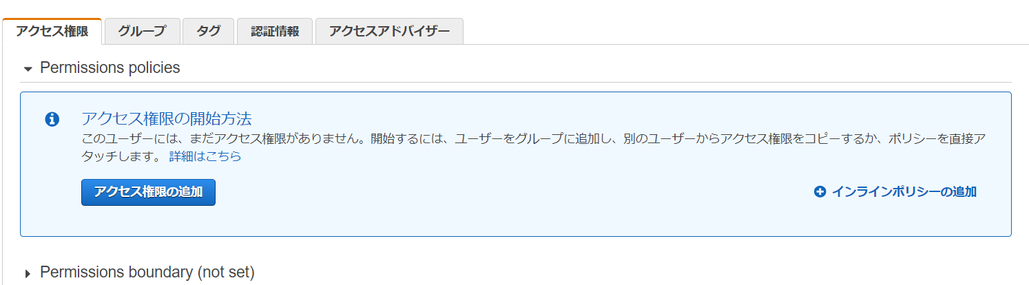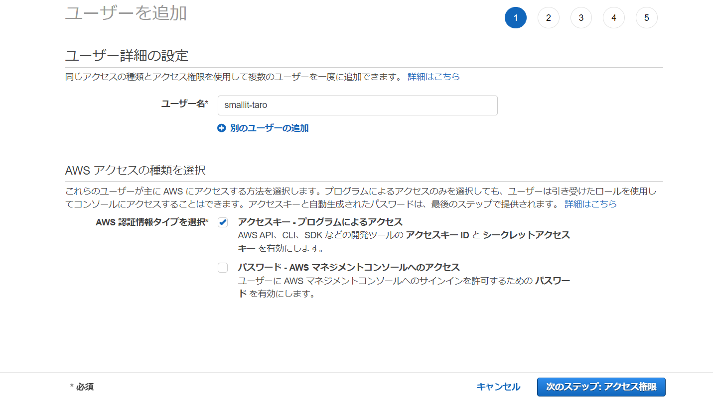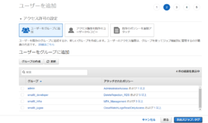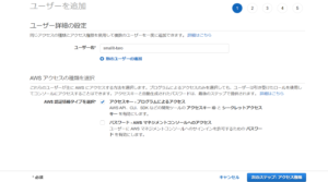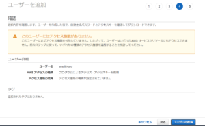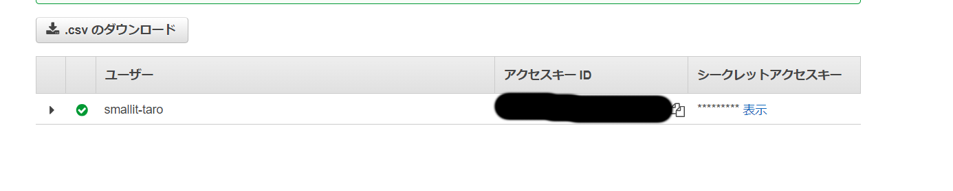 ⑤アクセスキーとシークレットアクセスキーはアプリから使用するために必要になるので、保存しておく