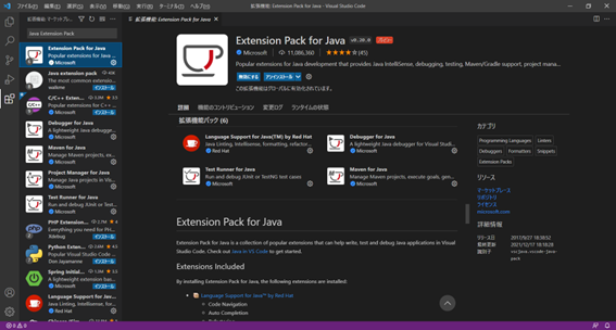 1.VS Codeで、拡張機能のサイドバーを開き、テキストボックスに 「java」と入力すると拡張機能のリストに 「Java Extension Pack」が表示されるので、インストールをクリックする。