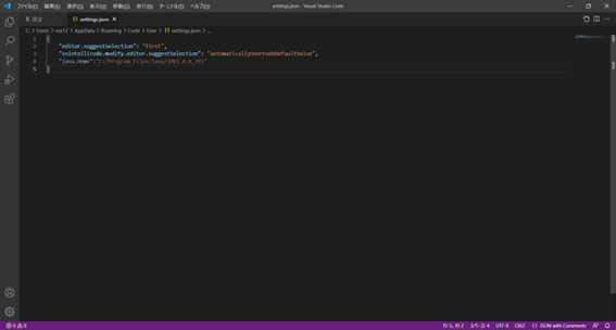 2.設定を選択して、検索バーに「java home」を入力して、「settings.jsonで編集」をクリックして、java homeの設定を行う、