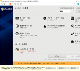 ・使用する言語を選択して、インストール先のディスク、rootパスワードの設定を行い、「インストールの開始」を選択します。