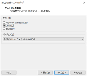 ・ゲストOSに「Linux」、バージョンに「その他の Linux 5.x カーネル 64bit」を選択します。