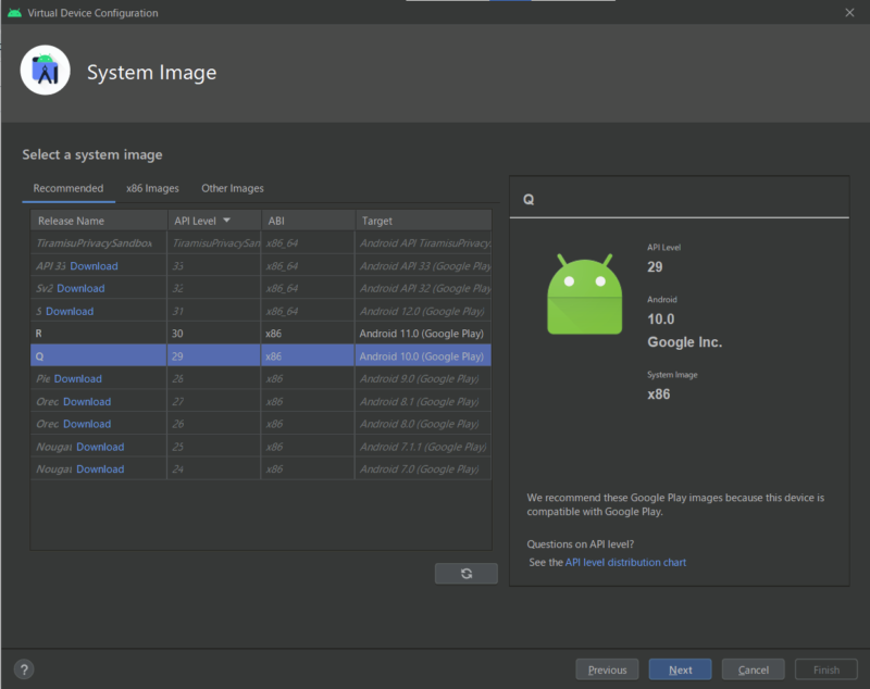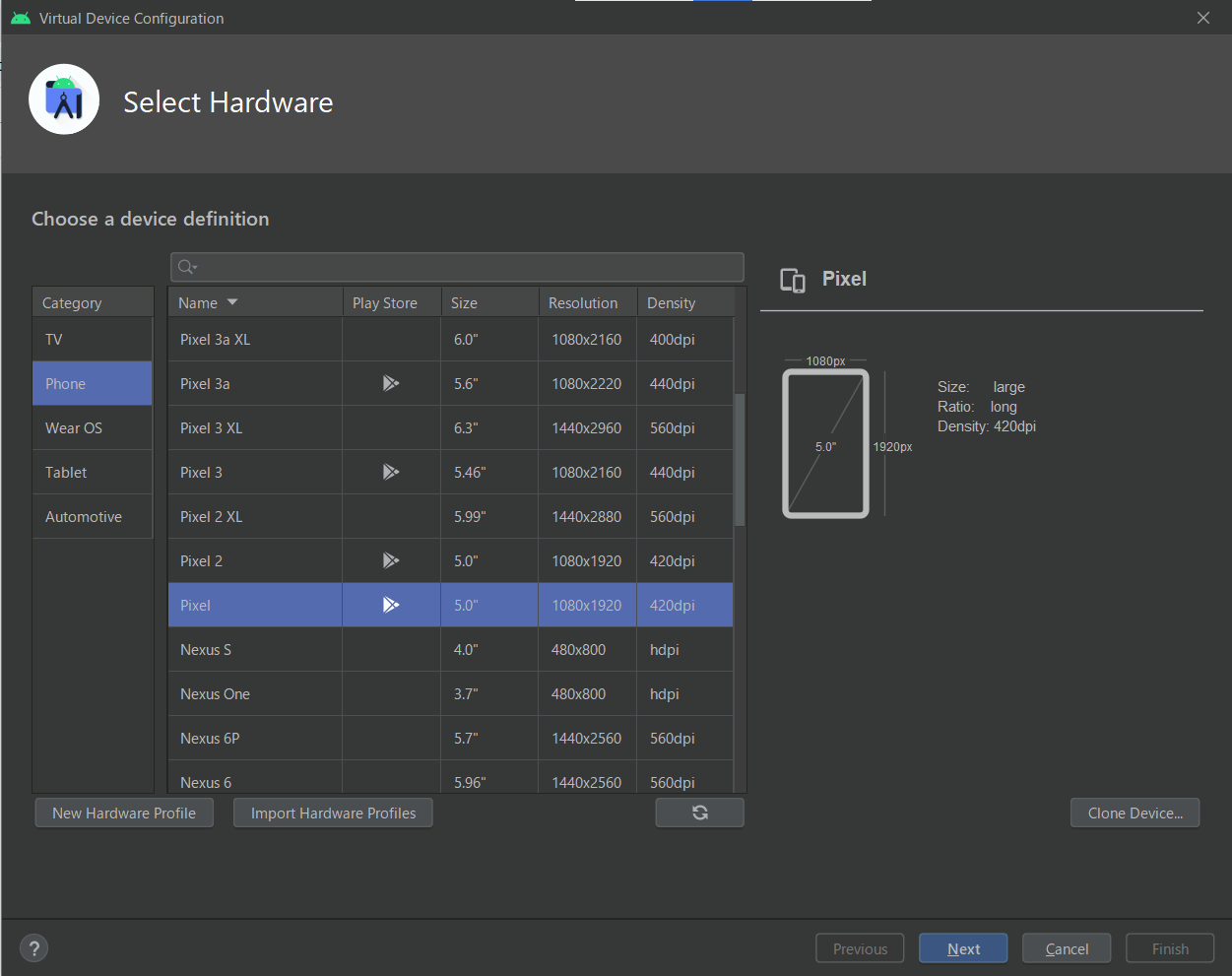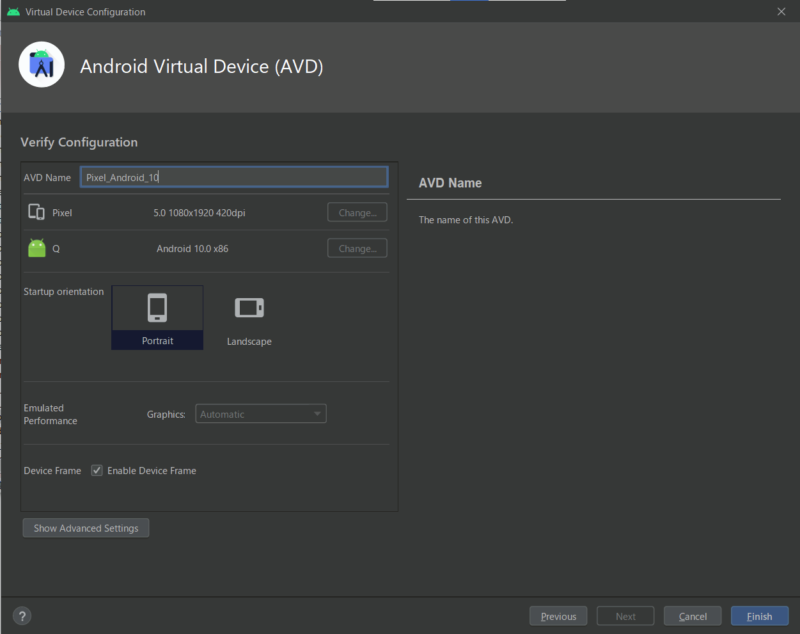 AVD Nameに任意の値を入力し「Finish」を押下すると3.の画面に登録したデバイスが表示される