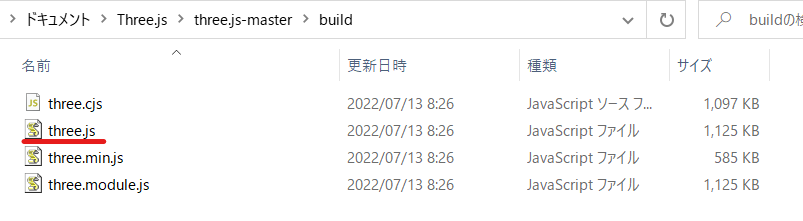 ダウンロードしたthree.js-master.zipを展開して、three.jsファイルを任意の作業フォルダにコピーします。