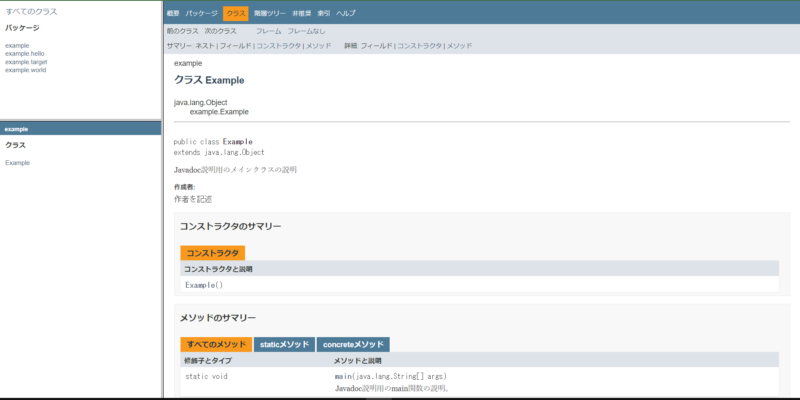 /** * Javadoc説明用のメインクラスの説明 * * @author 作者を記述 */ public class Example { |