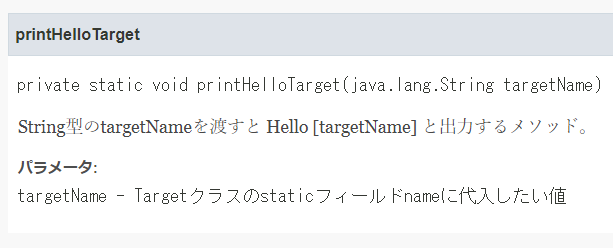 Javadocタグを記述することで引数や返り値の説明などをWebサイトでうまい具合に表示してくれます。Javadocタグは複数記述することが可能です。