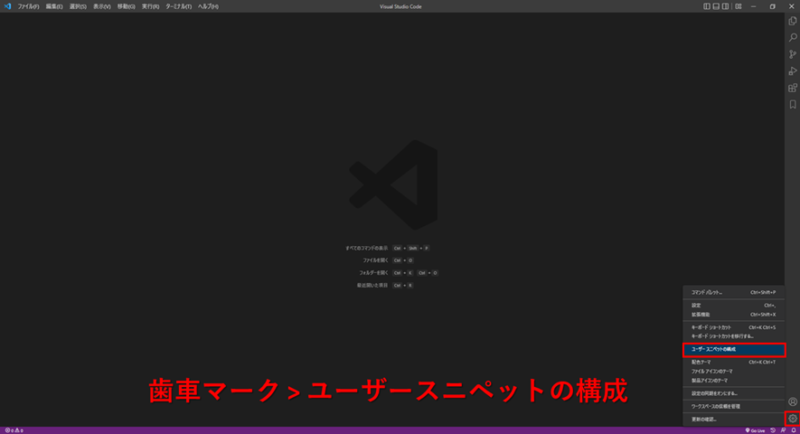 または、以下の歯車マークから『ユーザースニペットの構成』を選択します。