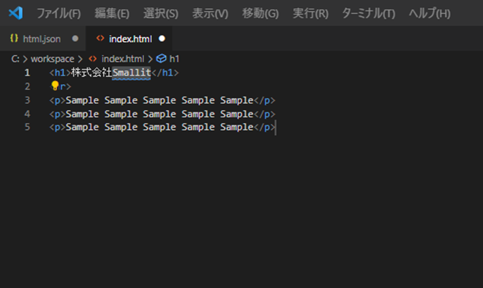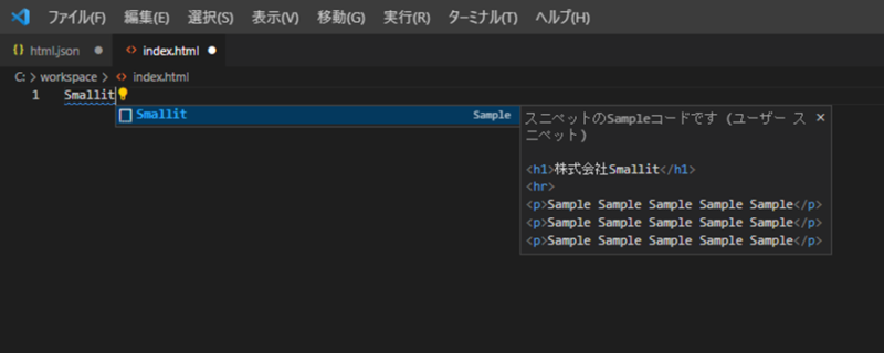 { "Sample": { "prefix": "Smallit", "body": [ "<h1>株式会社${1:Smallit}</h1>", "<hr>", "<p>Sample Sample Sample Sample Sample</p>", "<p>Sample Sample Sample Sample Sample</p>", "<p>Sample Sample Sample Sample Sample</p>", ], "description": "スニペットのSampleコードです" } } |