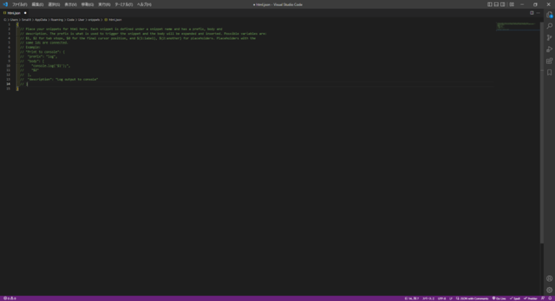 ③ HTMLのJSONファイルを選択後、以下の表示がされます。中括弧内は、スニペットの説明とサンプル例がコメントアウトされています。