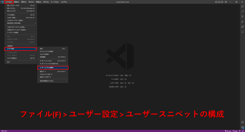 ① VSCodeのメニューバーにある『ファイル』から『ユーザー設定』の『ユーザースニペット』を選択します。