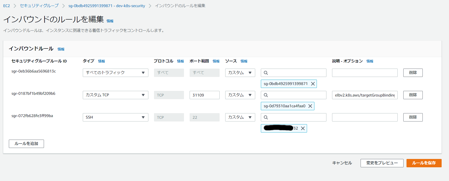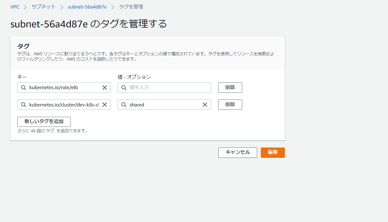キー:kubernetes.io/cluster/dev-k8s-cluster※クラスタ名は各自置き換えてください。
