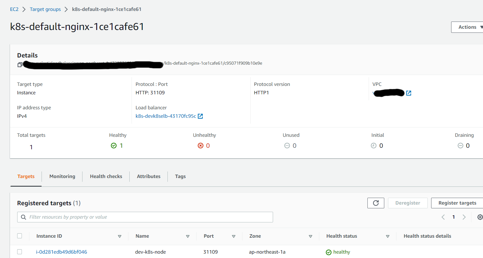 ③target groupにK8SノードEC2が追加されていることを確認します。