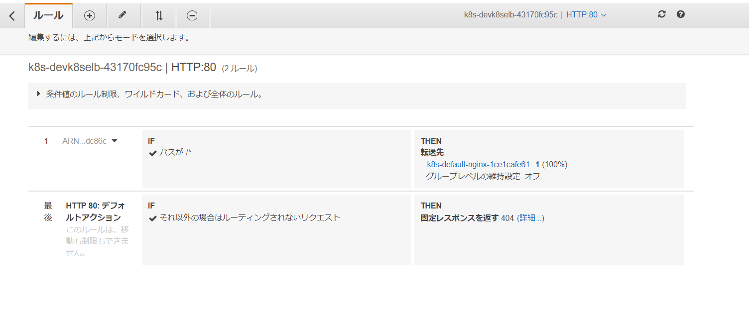 ②Application Load Balancerのルールにnginxが設定されていることを確認します。