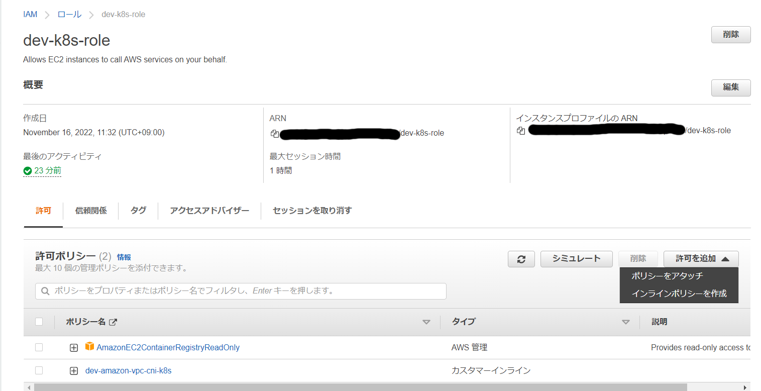 EC2に設定されているロール:dev-k8s-role※ここは自分のEC2に割り当てられているロールに置き換えてください。