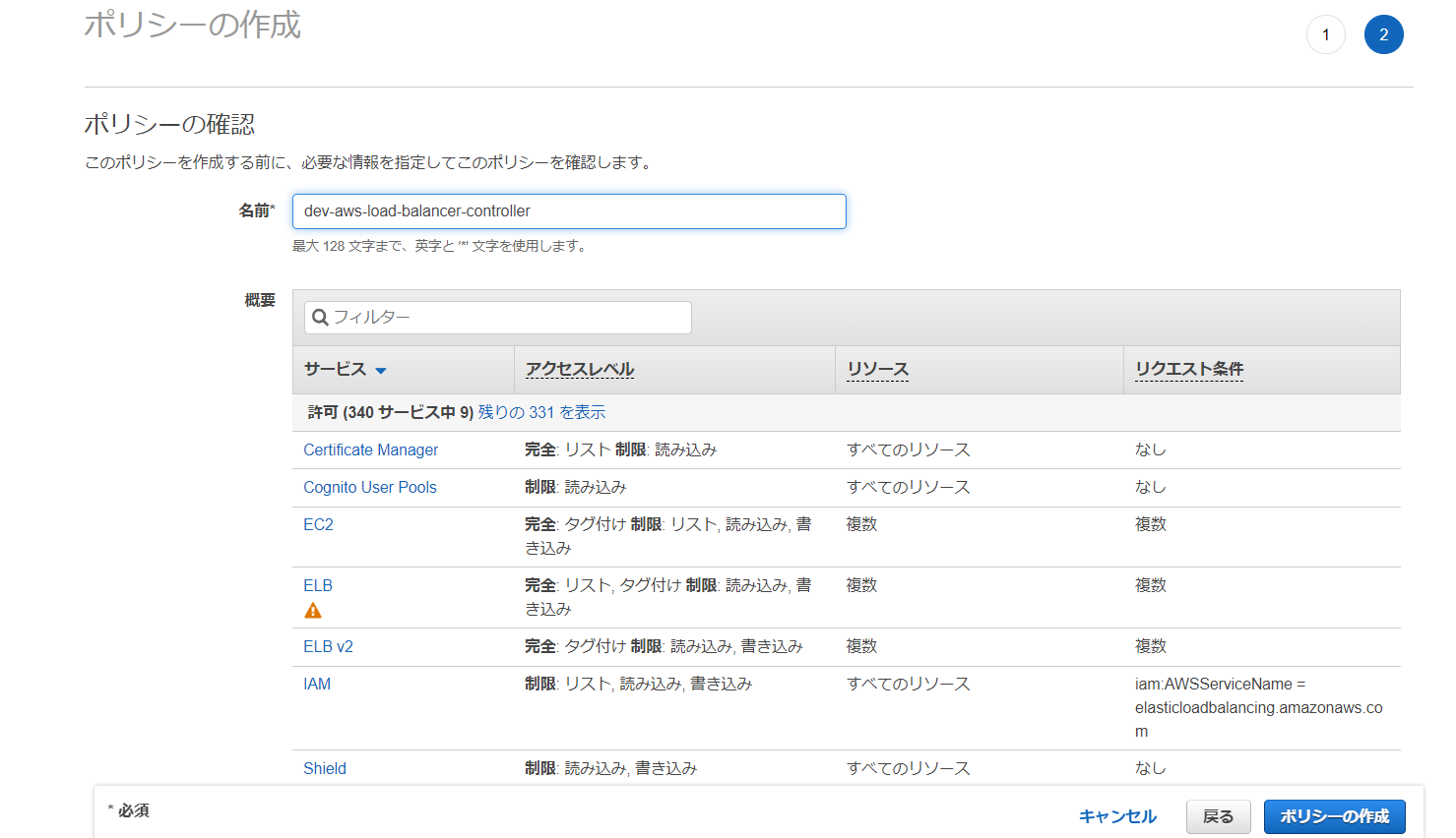 ポリシー名:dev-aws-load-balancer-controller