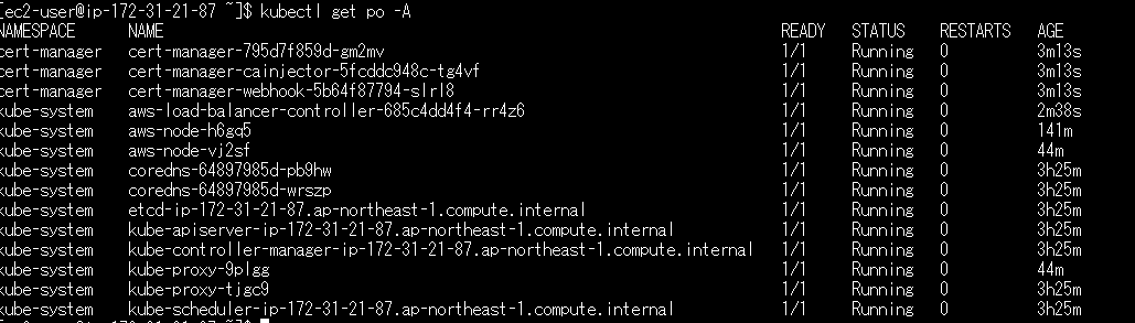 aws-load-balancer-controllerのSTATUSが「Running」になれば正常です。