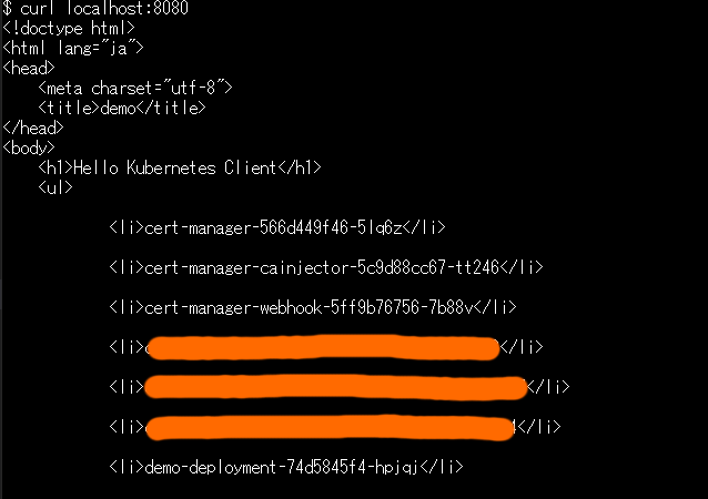 <!doctype html> <html lang="ja"> <head> <meta charset="utf-8"> <title>demo</title> </head> <body> <h1>Hello Kubernetes Client</h1> <ul> <th:block th:each="pod : ${pods}"> <li th:text="${pod}"></li> </th:block> </ul> </body> </html> |