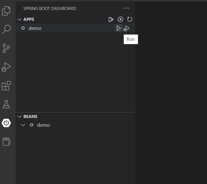 ⑪VSCode左側のSpring bootのアイコンを選択し、demoアプリケーションを実行します。