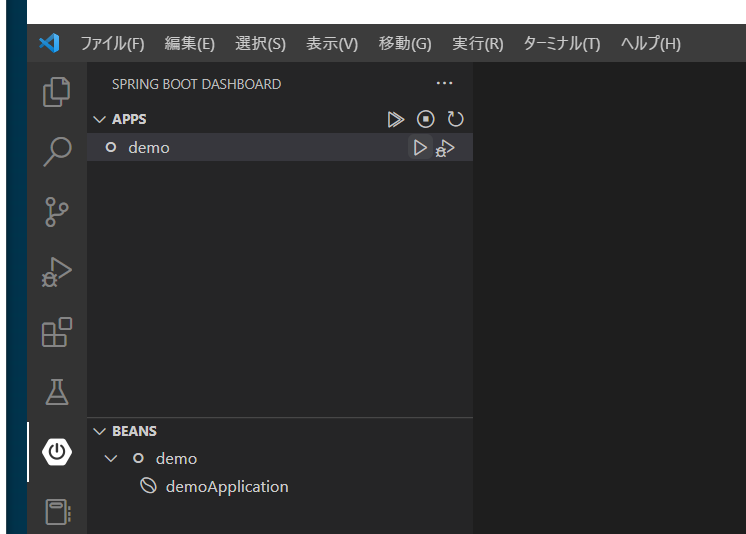 ⑪VSCode左側のSpring bootのアイコンを選択し、demoアプリケーションを実行します。