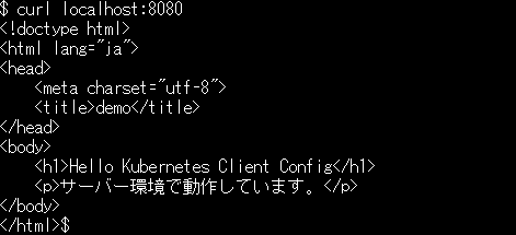 <!doctype html> <html lang="ja"> <head> <meta charset="utf-8"> <title>demo</title> </head> <body> <h1>Hello Kubernetes Client Config</h1> <p th:text="${message}"></p> </body> </html> |