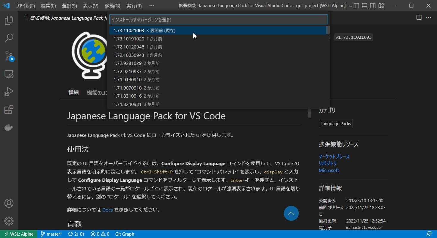 今のバージョンが最新のバージョンになっていなかったため、前述の「別のバージョンをインストール」を行い、VSCodeを再起動。
