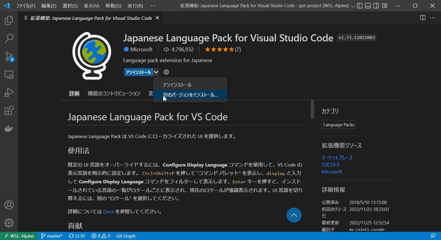 しばらくして、Japanese Language Packが最新のバージョンの時にダイアログのみ英語表記となる状態に…。ただ、こちらは1つ下のバージョンにダウングレードすることで解決しました。