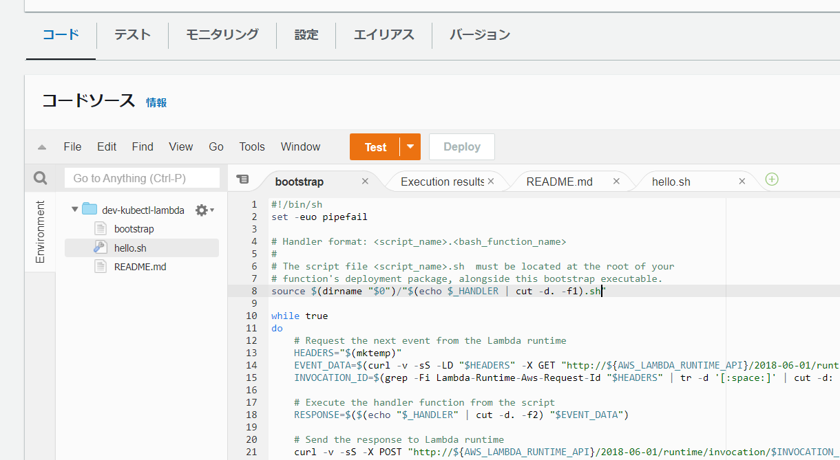 ④lambdaのコードタブで「hello.sh.sample」を「hello.sh」にファイル名を変更します。