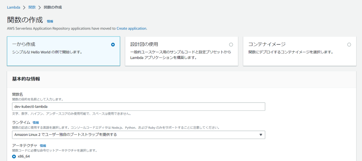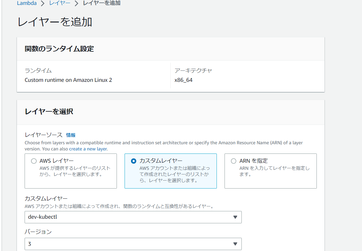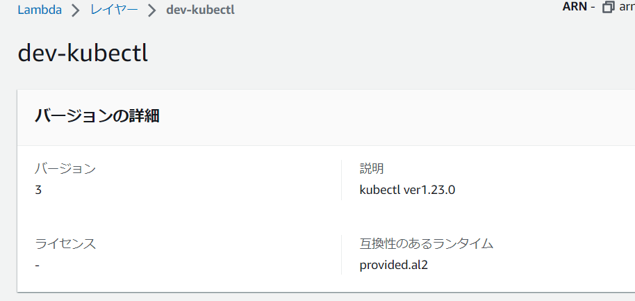aws lambda publish-layer-version \ --layer-name dev-kubectl \ --content S3Bucket=dev-lambda-layer-tmp,S3Key=layer.zip \ --compatible-runtimes provided.al2 \ --description 'kubectl ver1.23.0' |