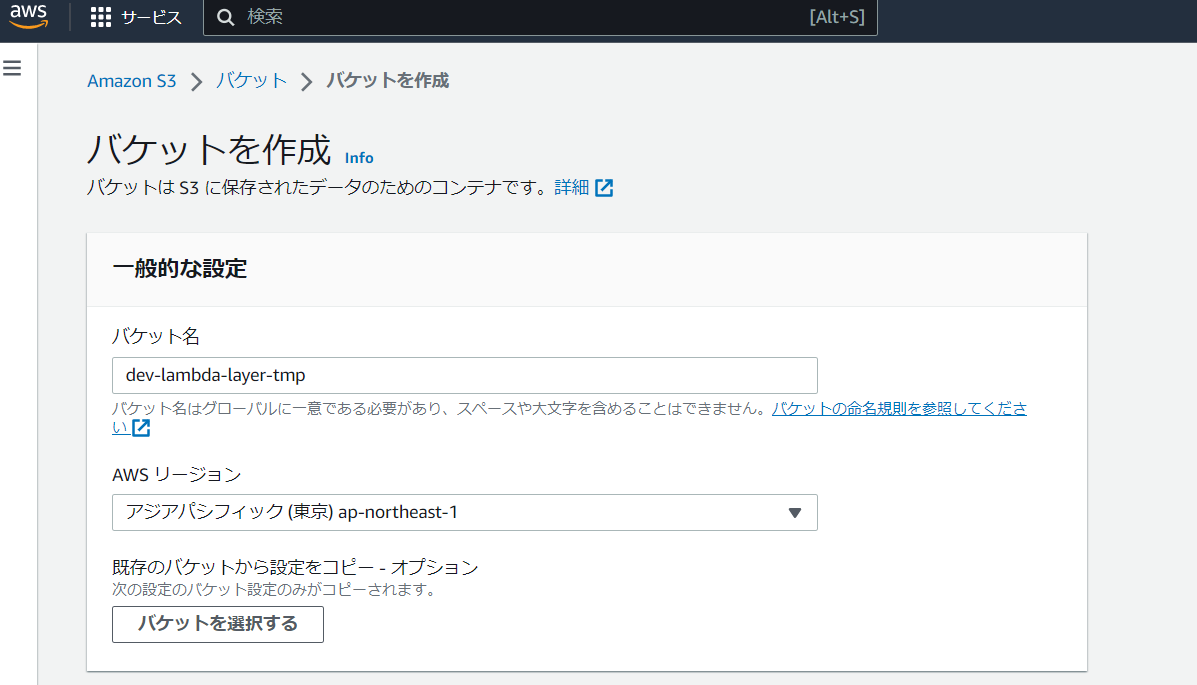 【1】Lambda Layerのzipファイルを格納するS3を作成します。