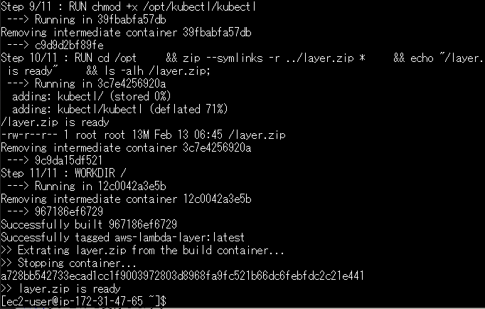 「>> layer.zip is ready」と表示され、「layer.zip」が作成されていれば成功です。