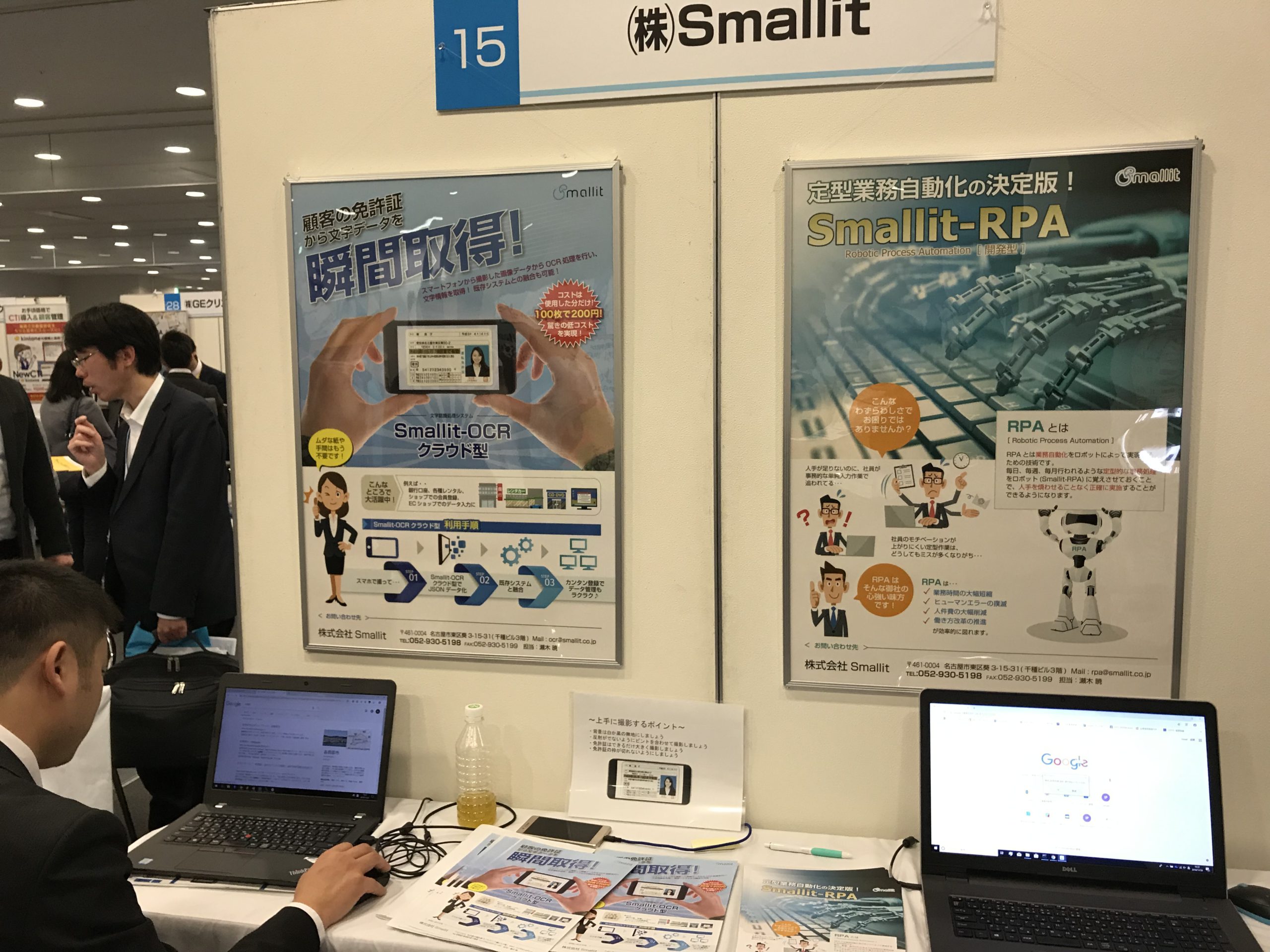 2018.11.22 会社活動 クラウド・IT・ビジネスメッセ 2018 in名古屋 に出展しました この記事を書いたチーム:chocochip 2018年11月20日(火)にウインクあいちで「クラウド・ITビジネスメッセ 2018 in 名古屋」が開催され、弊社ではSmallit-OCR,Smallit-RPAの展示をおこないました。 Smallit-RPAのデモでは「旅行ガイドの自動作成」、Smallit-OCRのデモでは「免許証の自動読み取り」を行いました。 実際にお客様に操作をしていただき、 「後ろで、誰か操作しているんじゃない!?」 「もう、テキストに変換されたの!早い!!」 といった嬉しいご意見をいただきました。 展示会で紹介した内容は後程HPに掲載予定ですので、ぜひご覧ください。